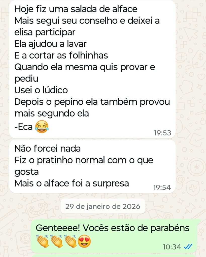 A velocidade dos resultados pode variar, mas muitos pais começam a ver melhorias nas atitudes alimentares de seus filhos dentro das primeiras semanas após a aplicação das técnicas.